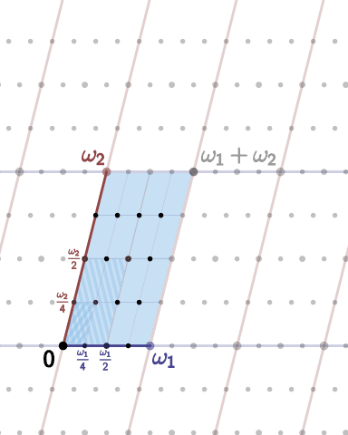L’image ci-dessus met en évidence (dans le cas ) le fait que le sous-groupe des points d’ordre d’une courbe elliptique complexe est de cardinal . Ce résultat se transfère à certaines caractéristiques et est fondamental dans la compréhension de certains vecteurs d’attaque de la cryptographie sur courbes elliptiques. Cet exemple est mentionné en page 10 de la présentation The group structure of rational points of elliptic curves over a finite field de Damien Robert.