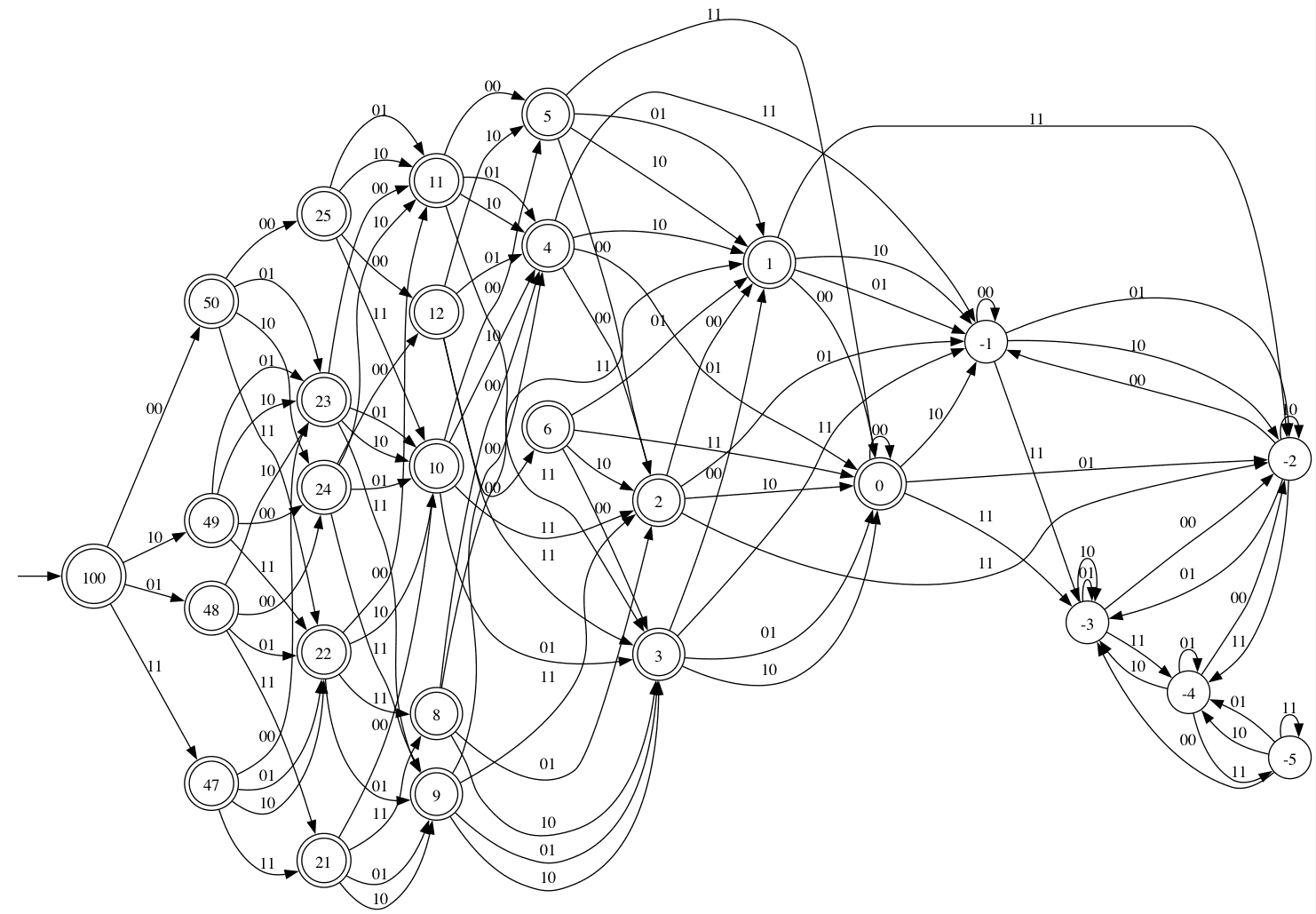 >>> automata.accept(encode(23, 16))True # 2 * 23 + 3 * 16 = 94 <= 100>>> automata.accept(encode(33, 28))False # 2 * 33 + 3 * 28 = 150 > 100