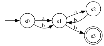 from automathon import DFAQ = {"s0", "s1", "s2", "s3"}sigma = {"a", "b"}delta = {"s0": {"a": "s1","b": "s1",},"s1": {"a": "s2","b": "s3",},"s2": {"b": "s1",},"s3": {}}automata = DFA(Q=Q, sigma=sigma, delta=delta, initialState="s0", F={"s3"})