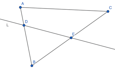 Soient trois points non alignés et une droite du plan qui ne passe par aucun des points ; si la droite passe par l’un des points du segment , elle passe ou par un point du segment ou par un point du segment .
